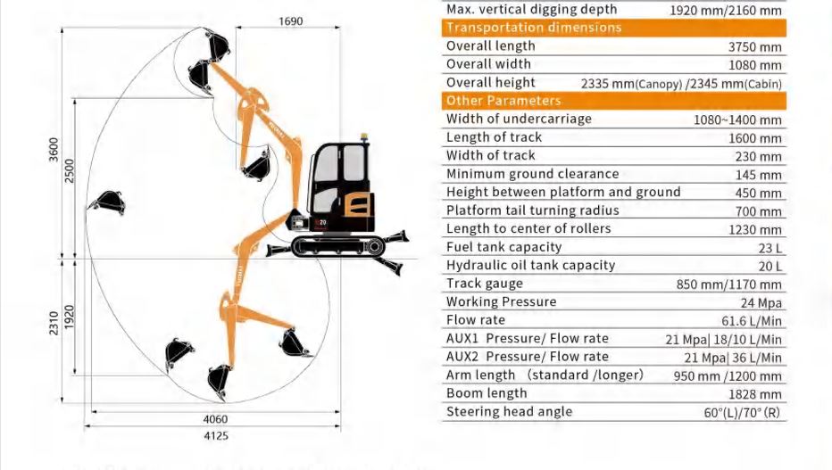 Yuchai U20 er en zero tail swing (kort bagende) model, hvilket betyder, at maskinen kan arbejde sikkert i meget trange områder uden at bagenden svinger ud over larvefødderne. Sammen med den udskydelige undervognssystem – der kan justeres fra ca. 1080 mm til 1400 mm – giver det optimal fleksibilitet: smal nok til adgang gennem snævre passager og bred nok til stabilt arbejde under belastning.