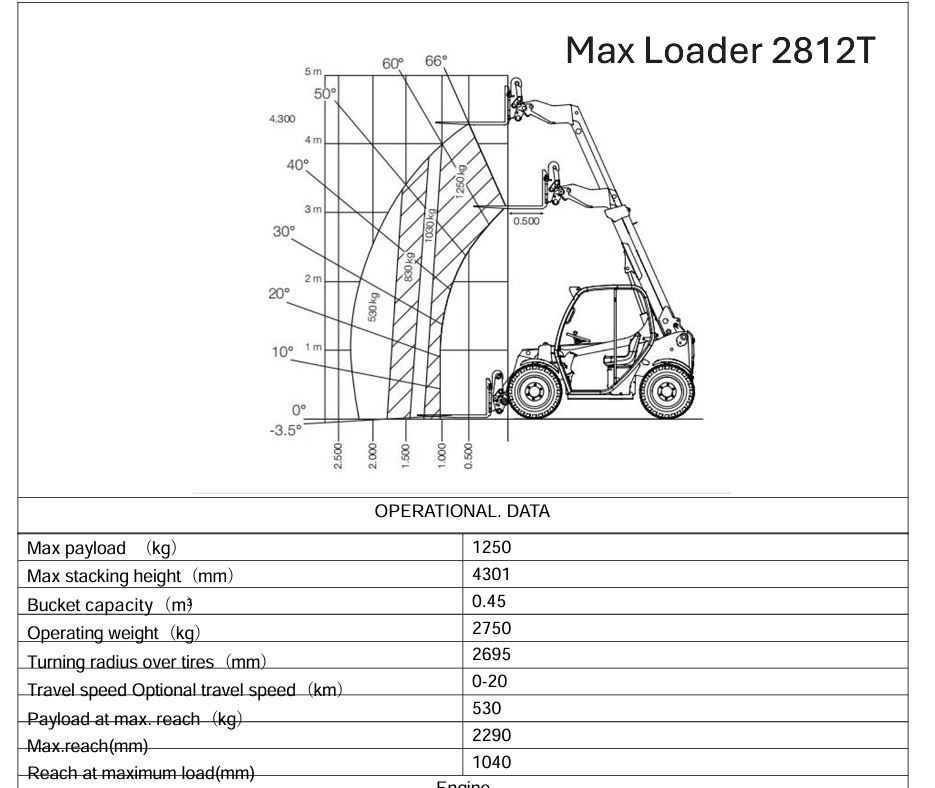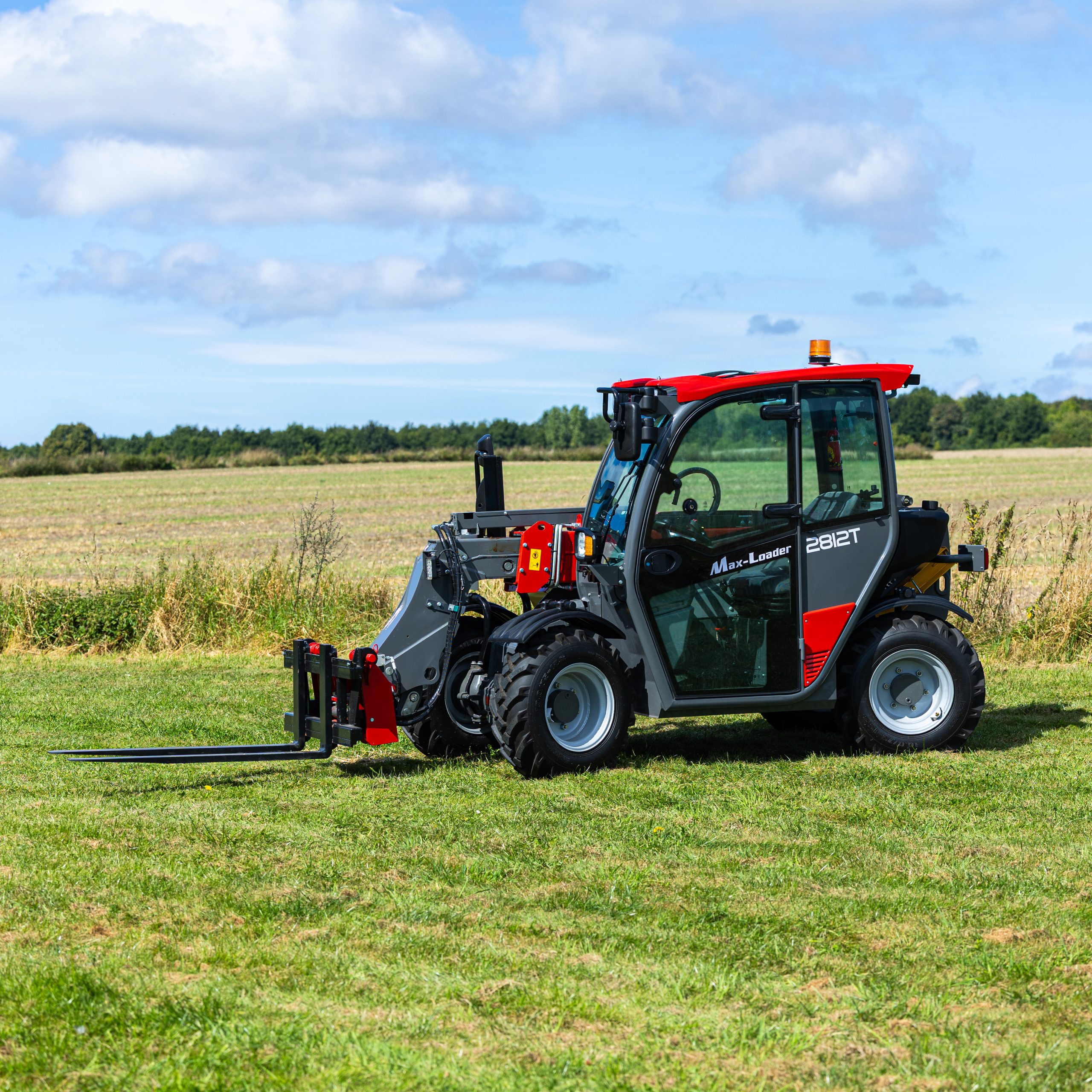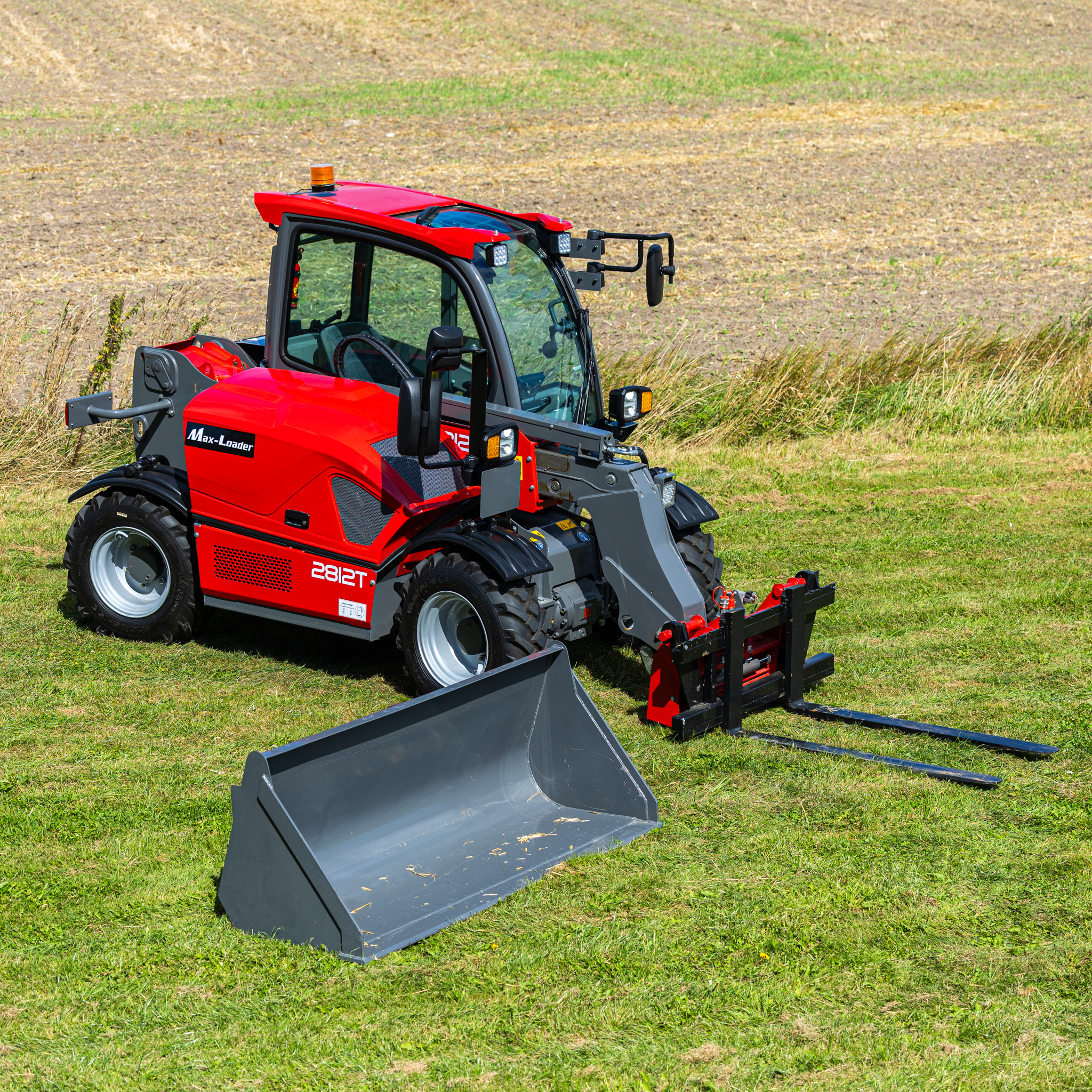 Max Loader 2812T er en stærk 4wd teleskop læsser, med 4 hjuls styring. Den er nem at kører på smalle steder, og kommer let omkring skarpe hjørner. Alle maskinens drift funktioner sidder i muliti funktionshåndtaget for løft sænk, kip og teleskop, samt andre hyd funktioner. En maskine med mange funktioner, fx krabbestyring, automatisk teleskopfunktion ved løft mm.m.  Det lave tyngdepunkt gør maskinen meget stabil, og sikker at køre for selv den uerfarne bruger. Transmissionen er hydrostatisk, 2 gear frem og 2 gear bak.  Løfter 1200 kg op i 4,3 meters højde. Vejer kun 2800 kg hvilket gør den kan transporteres på trailer.